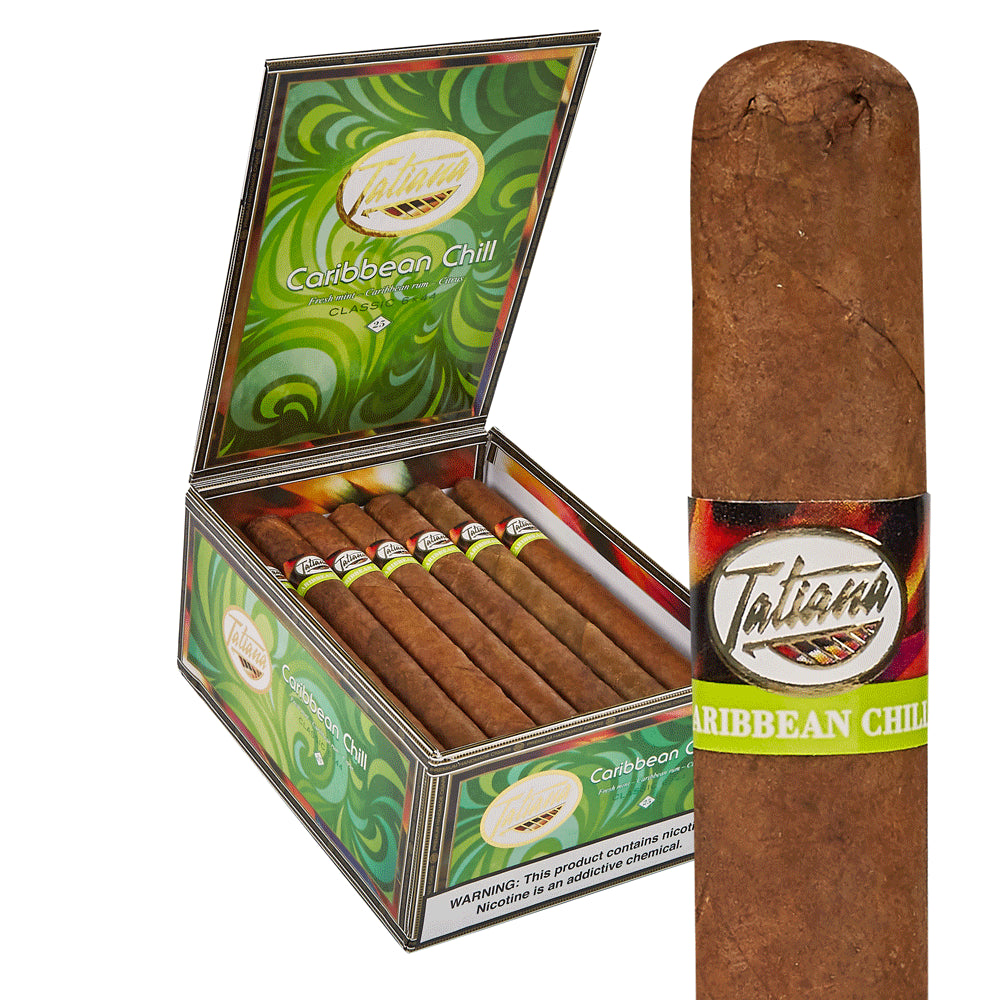 Tatiana Caribbean Chill cigars have a refreshing flavor of mint, Caribbean rum, and citrus notes creating a taste that is smooth and mellow, accompanied by a pleasant aroma sure to appease all